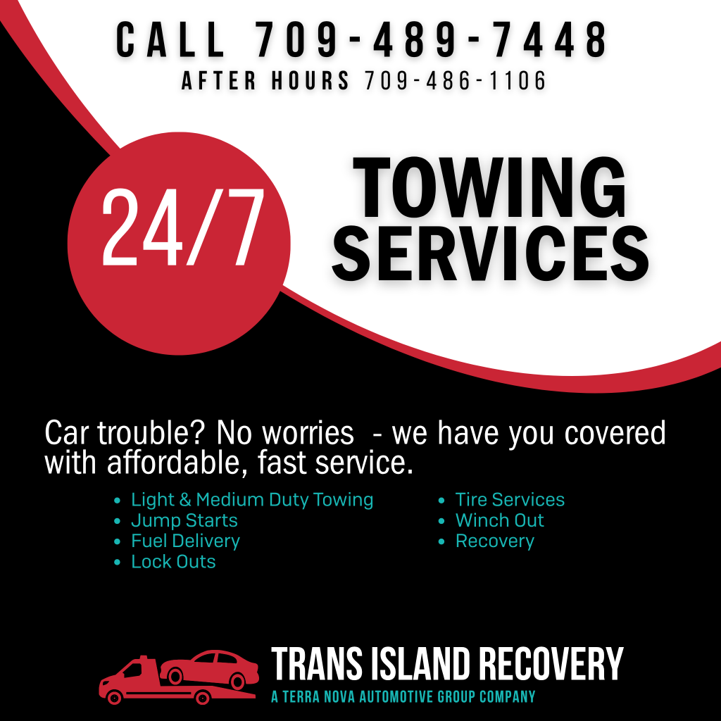 Located in Central Newfoundland, Trans Island Recovery operates island wide. We offer towing services anywhere within the province of Newfoundland and Labrador. Services provided include: